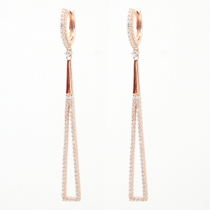 Par aros linea premium, rosados, colgantes, tipo triangulo, con piedras blancas